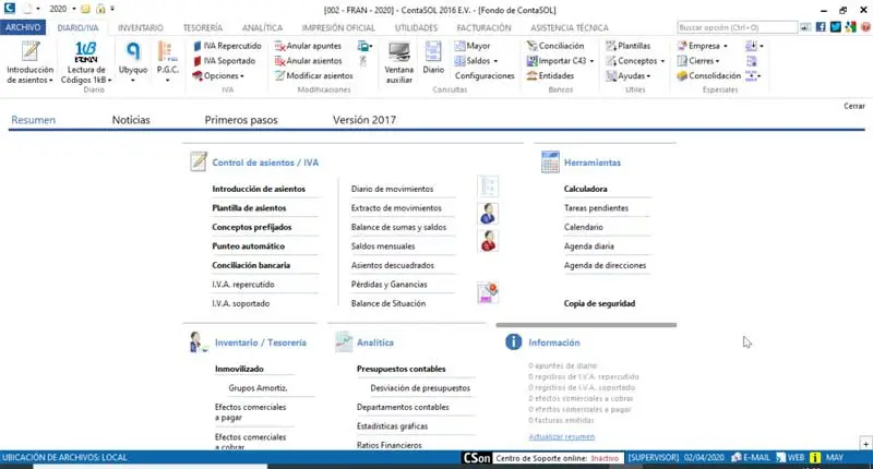 Contasol est un programme de comptabilité plus qu’efficace et solvable avec lequel nous pourrons avoir tous les livres officiels et fiscaux. Il peut être installé sur un réseau et possède une interface graphique très simple et intuitive. Il contient tous les modules officiels, ainsi que le PGC 2007, le PCG PYMES 2007, le plan comptable pour les entités à but non lucratif et les adaptations sectorielles. Avec Contasol, nous pouvons conserver les comptes du journal et les registres de TVA, ainsi que l’inventaire ou l’analyse de notre société ou entreprise. Nous pouvons également effectuer des tâches de facturation et imprimer tous les documents officiels tels que les livres comptables, les rapports de comptes annuels et les modèles de TVA et d’impôt sur le revenu des personnes physiques.