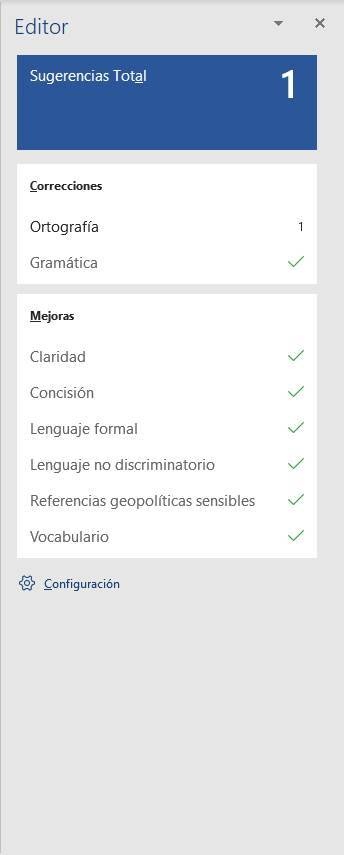 Comme c’est souvent le cas avec tous ces types de fonctions (relecteurs, traducteurs, etc.), elles sont conçues pour fonctionner notamment en anglais. En espagnol, les services de Microsoft fonctionnent vraiment très bien, mais il y a des fonctions dont nous ne pouvons pas profiter dans notre langue. Par exemple, lisibilité ou ponctuation de l’éditeur. Nous pourrons peut-être profiter de ces fonctionnalités dans les futures mises à jour.