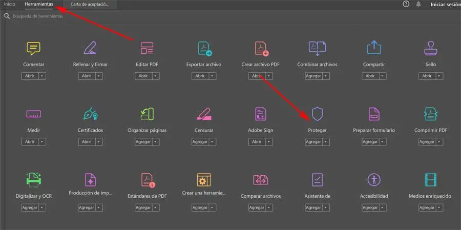 Il existe de nombreuses fonctions intégrées ici, certaines gratuites et d’autres payantes . Par conséquent, dans cette fenêtre, nous n’avons plus besoin de localiser l’entrée appelée Protéger et de cliquer dessus pour définir le mot de passe pour accéder au PDF . Comme dans le cas précédent, cela nous aidera à empêcher les autres utilisateurs d’accéder au contenu de ce fichier.