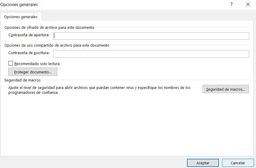 Celui-ci s’ouvrira à l’écran avec tout son contenu afin que nous puissions le modifier comme s’il s’agissait d’un fichier texte conventionnel. Mais dans le cas présent, ce que nous voulons, c’est les protéger. C’est quelque chose que nous pouvons faire directement à partir d’ici. Pour ce faire, le plus simple est d’utiliser la fonction Fichier / Enregistrer sous. Lorsque la fenêtre habituelle apparaît dans laquelle nous sélectionnons le chemin du disque, nous cliquons sur la liste déroulante marquée Outils / Options générales.