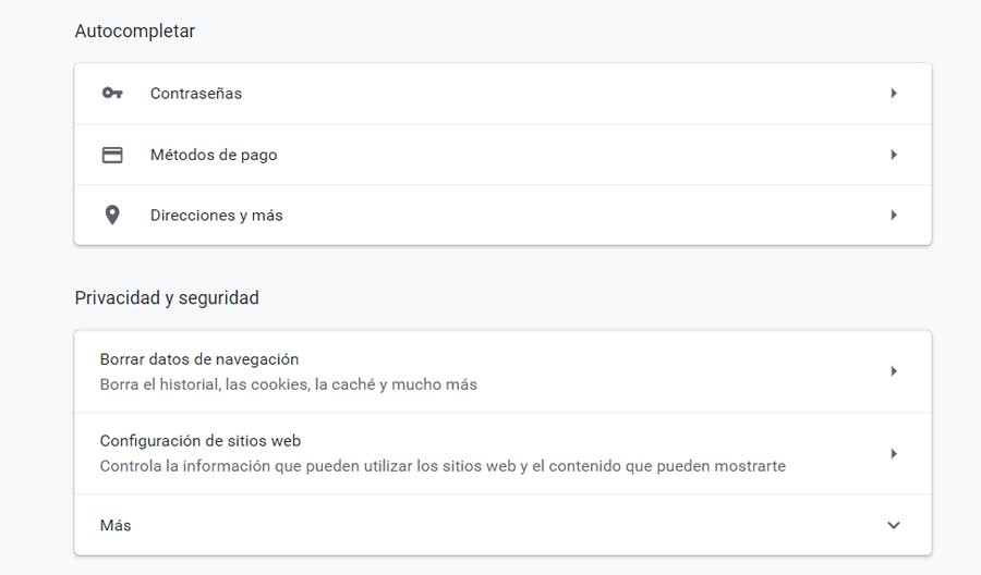 En raison de cette utilisation intensive dont nous parlons, en parallèle, au fil des mois ou des années, les informations que nous stockons dans ces programmes augmentent. Par exemple, si nous nous concentrons sur la proposition de ce type la plus largement utilisée dans le monde, Google Chrome , comme le reste des alternatives, stocke beaucoup de données. Ceux-ci font référence aux paramètres que nous enregistrons à partir de notre utilisateur , à l’historique de Chrome , aux mots de passe, aux signets, etc.