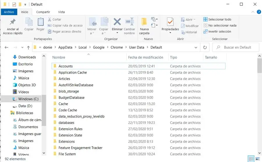 Par conséquent, pour atteindre ce que nous commentons, la première chose que nous allons faire est d’ouvrir une fenêtre de l’ Explorateur de fichiers Windows à partir de la combinaison Win + E. Ensuite, nous devons aller au chemin que nous allons indiquer: «C: \ Users \ your_user_name \ AppData \ Local \ Google \ Chrome \ User Data \ Default ».