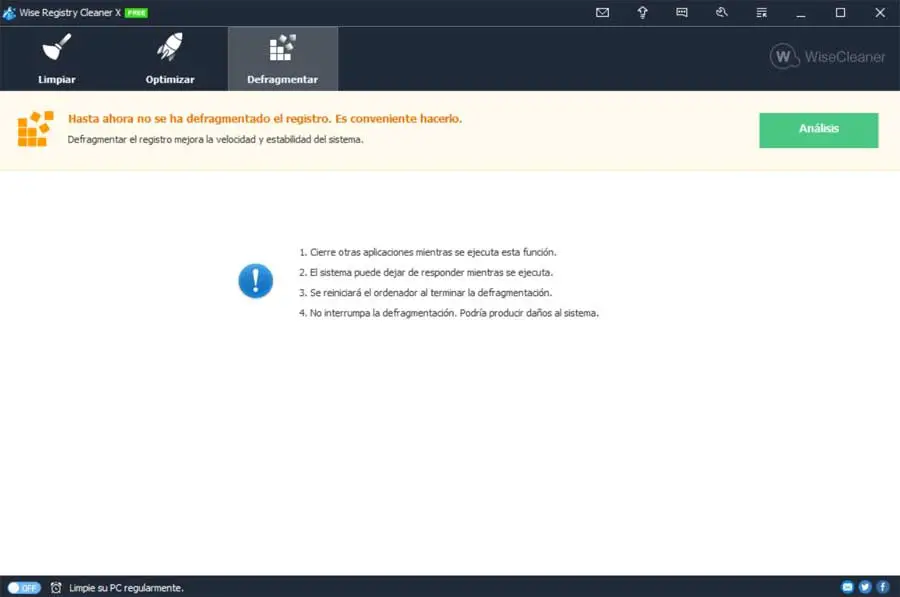 Par conséquent, comme vous pouvez l’imaginer, il s’agit d’un programme qui est responsable, à lui seul, du nettoyage du registre en tant que tel. En fait, il propose jusqu’à trois modalités pour cela, comme nous le verrons plus loin. Mais ce n’est pas tout, mais cette application nous aide également à défragmenter le registre Windows, comme s’il s’agissait d’un lecteur de disque. Et enfin, sa troisième grande fonction est qu’il optimise le système d’exploitation pour qu’il fonctionne de la manière la plus optimale.
