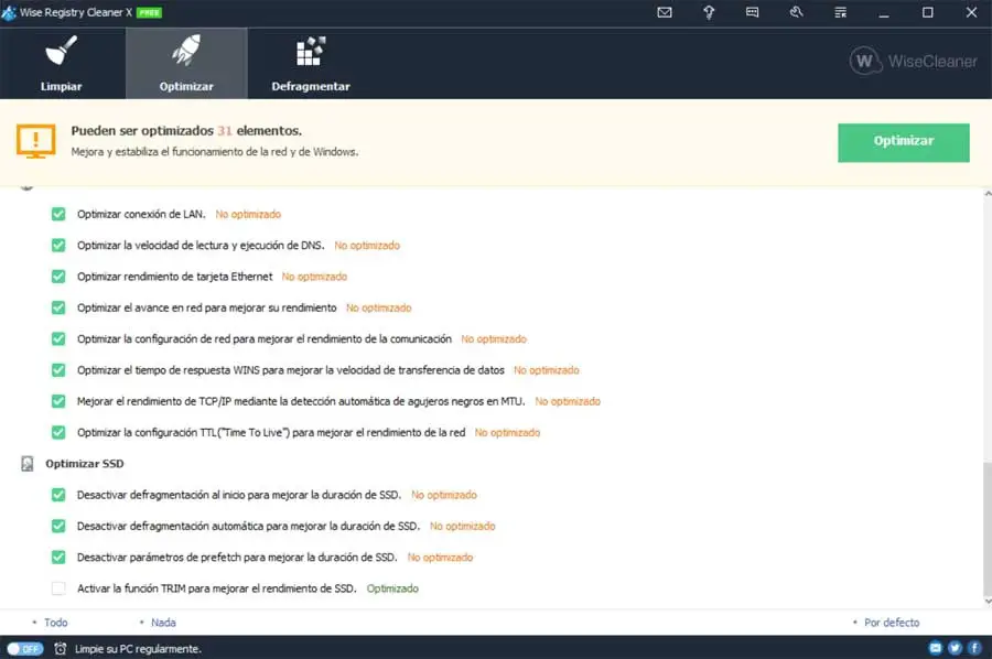 Et enfin, nous trouvons ici la fonction nommée Optimiser, à laquelle nous accédons également depuis l’interface principale du programme. Ici, nous allons trouver une liste avec une série d’entrées que nous pouvons marquer et qui seront chargées d’améliorer certaines sections de Windows. C’est là que des éléments tels que le réseau du système, le démarrage du système, la connectivité Internet, l’optimisation du disque SSD , etc. entrent en jeu .