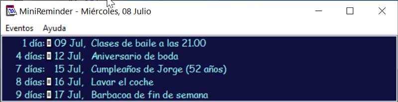 Une fois que nous l’exécutons, son menu principal apparaît , avec une interface très simple et en espagnol, comme on l’attend d’un programme de ce type. Dans celui-ci, nous aurons une petite barre d’outils en haut, avec les onglets Événements et Aide. Sous un panneau où apparaîtront les différents rappels que nous allons ajouter.