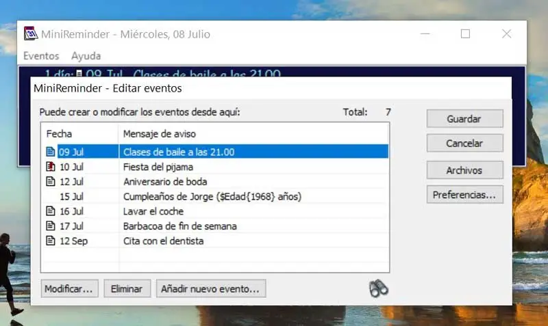 Une fois l’événement créé, il est également possible de le modifier ou de le supprimer, à partir du même onglet «Evénements». A cette occasion, il faut cliquer sur «Modifier les événements …» De là, si nous voulons modifier un événement, nous n’aurons plus qu’à cliquer dessus pour le marquer puis sur Modifier … Lorsque nous appuierons, la même fenêtre apparaîtra comme lorsque nous voulons ajouter un nouvel événement, mais avec les données enregistrées que nous pouvons modifier à notre guise. Si nous voulons supprimer un rendez-vous enregistré, sélectionnez-le et appuyez sur le bouton «Supprimer» .