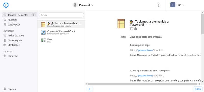 1Password est l’un des gestionnaires de mots de passe les plus populaires qui nous permet de sauvegarder toutes sortes d’informations telles que le nom d’utilisateur, les mots de passe, les numéros de carte de crédit et les données pour remplir des formulaires. De plus, il dispose d’un générateur de mots de passe pour améliorer notre sécurité. L’application nous permet de faire une copie de sauvegarde de nos clés à partir d’un navigateur Firefox ou Microsoft Edge. Nous aurons également 1 Go de stockage et une assistance par e-mail 24 heures sur 24.