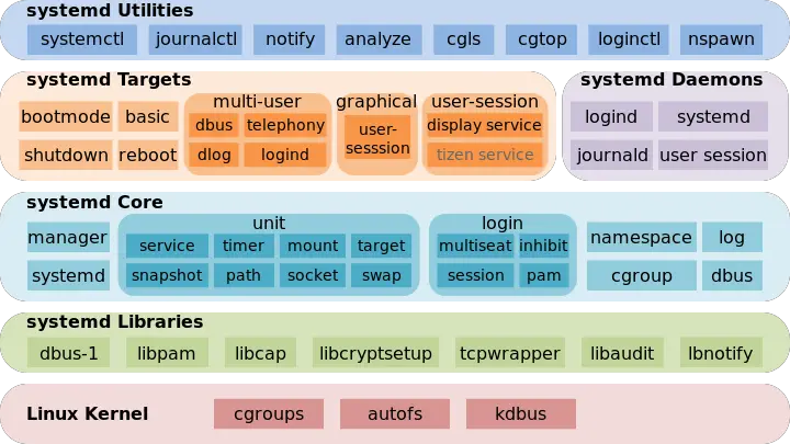 - Contrôleur démon . Que ce soit Init.d, Systemd ou tout autre logiciel similaire, il est nécessaire d’avoir un sous-système au-dessus du noyau qui est responsable du démarrage de tous les processus (démons) nécessaires au fonctionnement du noyau. Sans cela, nous n’avons que de nombreuses lignes de code qui ne seront pas exécutées.