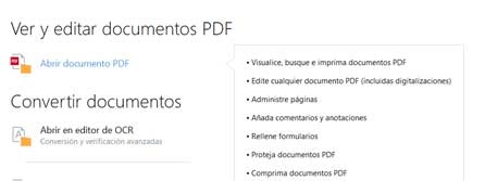 La première chose que nous rencontrons est l’une des fonctions considérées comme importantes et que nous allons beaucoup utiliser dans le programme, celle qui se concentre sur le travail avec des fichiers PDF. Par conséquent, pour cela, nous devrons cliquer sur Ouvrir le document PDF dans la section Afficher et éditer les documents PDF.