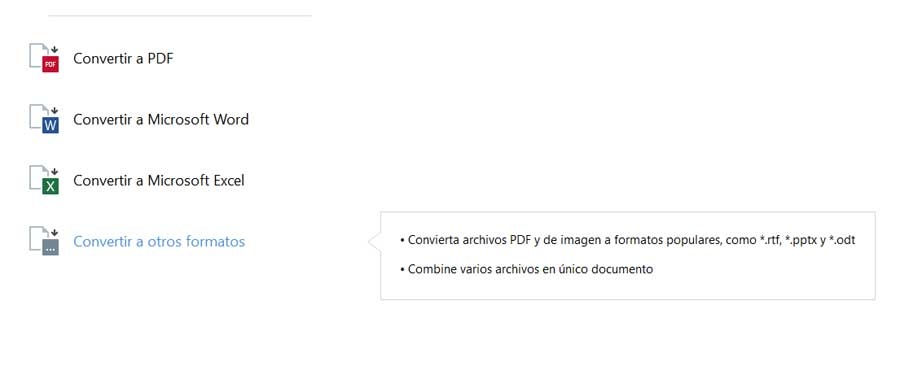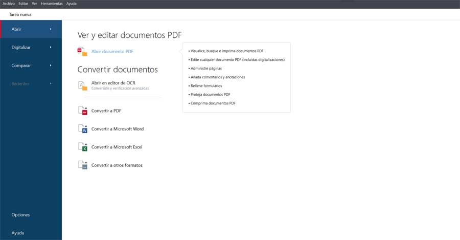 De plus, comment pourrait-il en être autrement, c’est une application qui nous permettra également de convertir les fichiers que nous avons numérisés par reconnaissance optique ou OCR. Pour tout cela, également à partir de l’interface principale de l’application, nous trouvons plusieurs raccourcis qui nous permettent d’effectuer ces tâches de conversion . Comme on peut le voir, l’interface mentionnée ci-dessus essaie de faciliter tout le travail autant que possible.