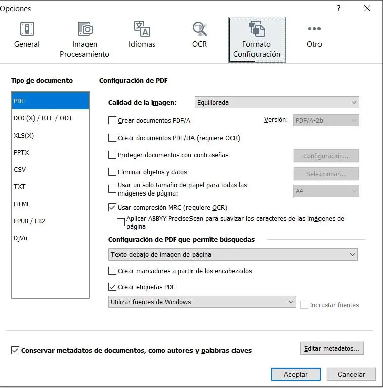 Ainsi, nous pourrons personnaliser le traitement des images des documents en numérisant les textes via OCR. En outre, dans le format de configuration, nous pouvons établir des mots de passe pour les documents créés, spécifier un format de papier par défaut, créer des signets , éliminer les éléments inutiles lors de la numérisation des documents ou activer la reconnaissance OCR en arrière-plan.
