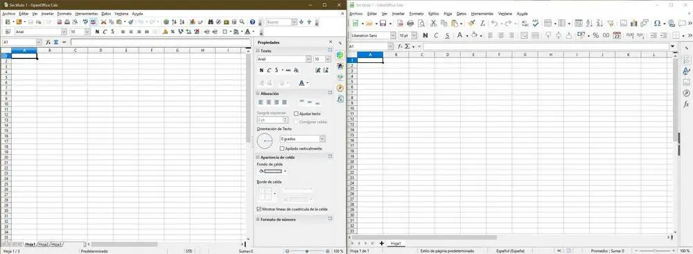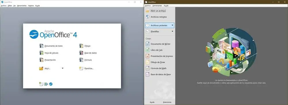 Les deux suites ont leur propre lanceur. Lorsque nous les ouvrons, nous pouvons voir un écran de synthèse et les différents programmes qu’il nous propose. Nous pouvons donc lancer le programme dont nous avons besoin en fonction du moment. OpenOffice a toujours son interface caractéristique, tandis que LibreOffice en a une différente, avec un panneau latéral. Ceci pour les goûts.