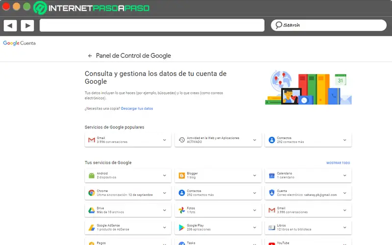 Heureusement, Google vous permet de consulter, gérer et optimiser facilement toutes les données de votre compte via le panneau de configuration . Lequel, vous pouvez le trouver à partir de l’URL suivante : «https://myaccount.google.com/dashboard?hl=es&utm_source=safety-center». Une fois que vous l’avez entré, le système vous fournit un excellent résumé de tous les produits Google que vous utilisez, via votre compte et, en plus, des données qu’ils contiennent.