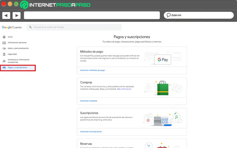 Une fois que vous accédez à la fenêtre de configuration de votre compte Google, sélectionnez correctement l’option qui dit «Paiements et abonnements» .