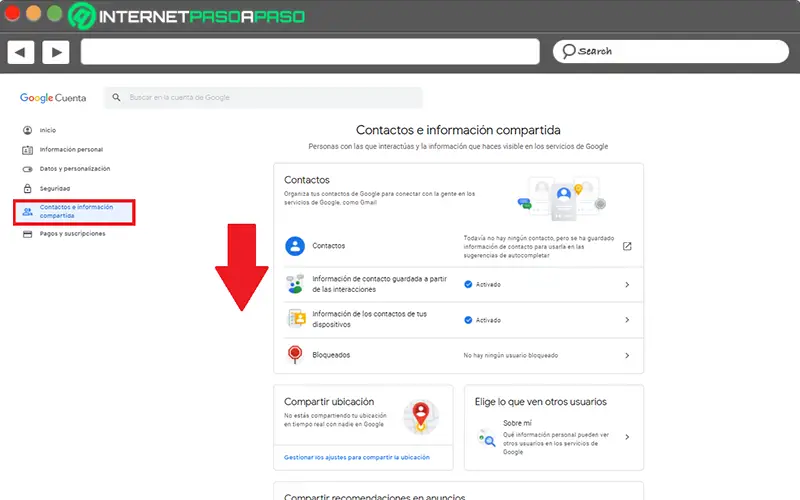 Directement depuis n’importe quel service Google, entrez les paramètres de votre compte Google. Ensuite, dans la liste des options, cliquez sur «Contacts et informations partagées» et gérez les aspects les plus importants pour acquérir une excellente sécurité.