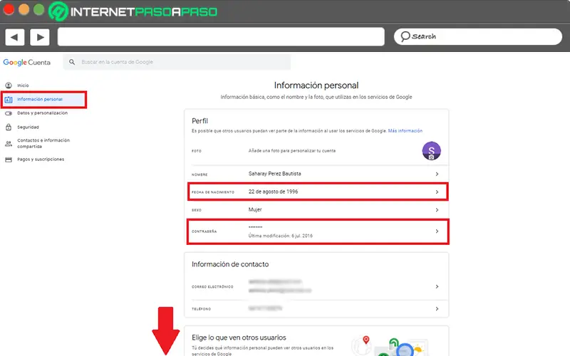Pour pouvoir accéder aux paramètres de Google, depuis n’importe quel site Web de cet écosystème (Gmail, Chrome, Drive, etc.), cliquez sur votre photo de profil dans le coin supérieur droit du panneau et choisissez l’option «Gérez votre compte Google» . Ensuite, allez dans le menu dans la barre latérale gauche et sélectionnez la catégorie qui dit «Informations personnelles» .