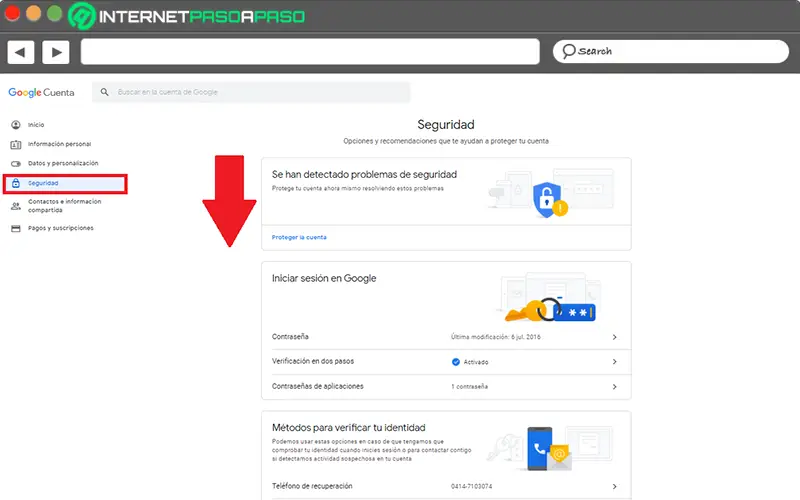 Comme dans les techniques expliquées ci-dessus, vous devez également commencer par accéder aux paramètres de votre compte Google . Lorsque vous êtes dans cette section, vous devez cliquer sur l’option «Sécurité» qui se trouve sur la liste de gauche.