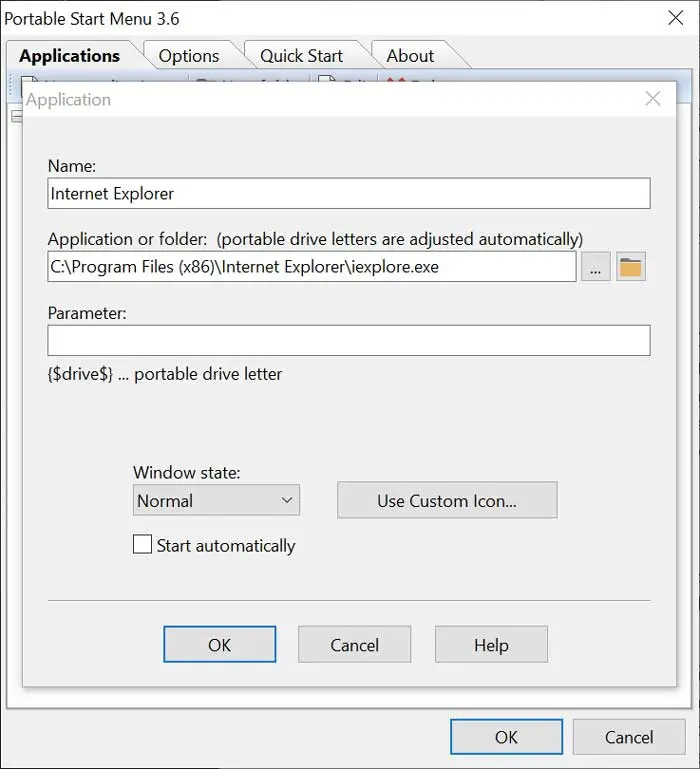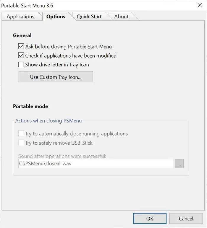 Si nous cliquons sur l’onglet «Options», nous pouvons choisir certaines options à indiquer. Par exemple, si nous voulons que le programme nous le demande avant de fermer, vérifiez si les applications ont été modifiées et affichez la lettre du lecteur où se trouve chaque application. Avec le bouton «Utiliser l’ icône de la barre d’état personnalisée», nous pouvons choisir une icône personnalisée à afficher dans la barre d’état système. Dans le cas où nous l’avons installé sur un appareil portable, nous aurons différentes actions lors de la fermeture du menu. Nous pouvons indiquer si nous voulons fermer automatiquement une application en cours d’exécution lorsque nous fermons le menu Démarrer portable. Nous pouvons également retirer la clé USB en toute sécurité lorsque nous fermons l’application.