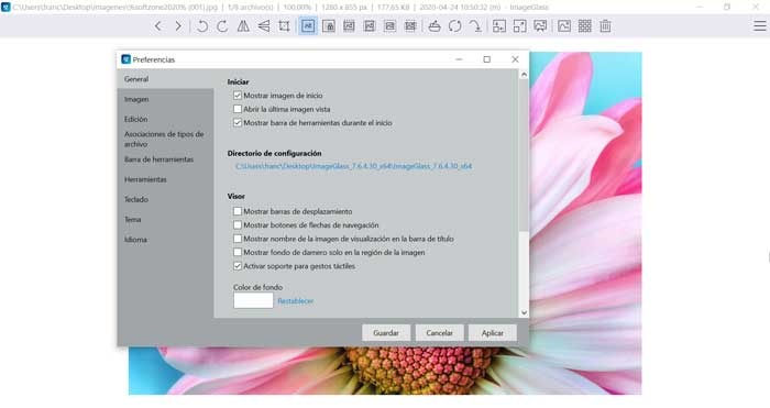Dans cette section, nous pouvons configurer certaines options du visualiseur que nous pouvons activer ou désactiver à notre guise. Nous aurons la possibilité d’afficher la barre de défilement, les boutons fléchés de navigation, le nom de l’image affichée dans la barre de titre ou d’activer le support des gestes tactiles, au cas où nous aurions un écran compatible. Nous pouvons également changer la couleur d’arrière-plan sur le ton que nous aimons le plus.