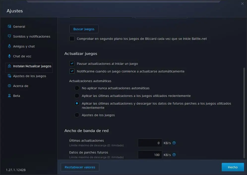 Nous pourrons également configurer le comportement des mises à jour. Nous pouvons choisir si nous voulons que les mises à jour soient suspendues au démarrage d’un jeu (ce qui est très important, étant donné que les jeux Battle.net sont généralement en ligne), ainsi que si nous voulons recevoir des notifications chaque fois qu’un jeu commence à se mettre à jour automatiquement.