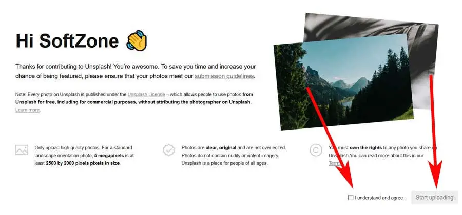 De même, quelque chose dont nous devons tenir compte et que les responsables du service nous préviennent également, c’est qu’ici nous trouvons une plateforme gratuite. Cela signifie que le contenu que nous partageons à travers celui-ci sera gratuit, à la fois pour le téléchargement et le téléchargement. Par conséquent, il se peut même que les photos que nous téléchargeons sur Unsplash soient utilisées à des fins commerciales par d’autres internautes.