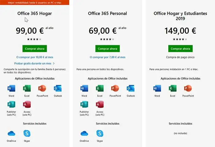 - Domicile et étudiants : très similaire à Personnel, mais dans ce cas, Outlook n’est pas inclus. Son prix est de 149 euros en un seul versement.