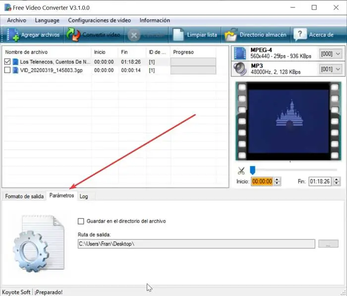 Una vez terminado con la configuración del vídeo y del audio, toca elegir la carpeta de destino para la conversión. Para ello pulsamos en la pestaña de «Parámetros» y en el apartado «Ruta de salida», pulsamos sobre el botón con tres puntos para seleccionar el directorio donde quedará guardada la conversión.