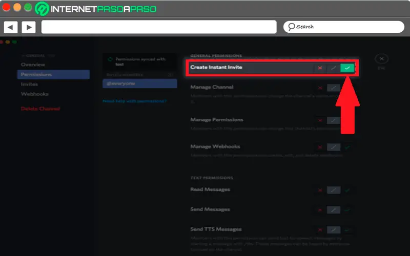 - Dans le cas de la coche verte, cela indiquera que la fonction sélectionnée a la permission activée . Dans l’image suivante qui sera montrée, vous pouvez voir comment tous les membres sont autorisés à créer un lien d’invitation instantanée pour le canal «Général» et de cette façon ils peuvent le partager avec d’autres utilisateurs.