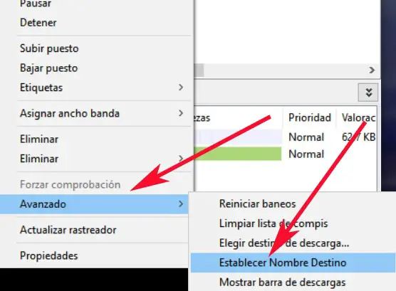 Ainsi, nous allons vous montrer le moyen le plus simple d’y parvenir via le client susmentionné, uTorrent. Pour ce faire, il suffit d’aller sur le fichier que nous téléchargeons à ce moment et de cliquer avec le bouton droit de la souris dessus. Ensuite, une série d’options apparaîtra à l’écran pour effectuer sur le torrent auquel nous nous référons. Ainsi, dans ce cas précis, nous avons opté pour le soi-disant «Avancé», puis cliquez sur «Définir le nom de la destination».