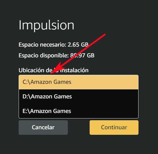 Ensuite, nous trouvons une nouvelle fenêtre qui indique la taille du jeu en tant que telle, ainsi que l’espace disponible dans l’unité sélectionnée. Cependant, nous avons la possibilité de modifier ce chemin d’ installation , ce qui nous intéresse ici. Par défaut, cela se fera dans un dossier que le client crée sur l’unité principale, appelé Amazon Games. Cependant, il suffit de cliquer sur le bouton avec deux flèches situées à droite, pour sélectionner toute autre unité de disque que nous avons connectée au PC .