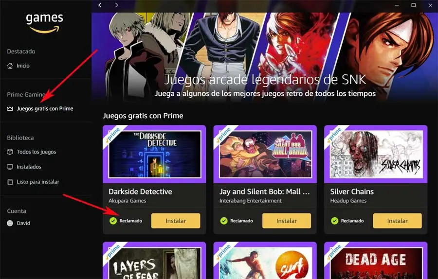 Tout d’abord, la première chose à savoir est que nous pouvons télécharger le client commenté à partir de ce lien . Ensuite, il nous suffit de saisir les informations d’identification de notre compte Amazon pour accéder à notre nom d’utilisateur personnel. Ainsi, une fois que nous démarrons le logiciel, nous trouvons une section intitulée Jeux gratuits avec Prime. Ici, nous pouvons cliquer sur Réclamer pour que les titres qui sont donnés deviennent une partie de notre bibliothèque .