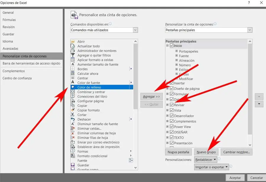 À côté de cette colonne, à droite, nous en trouvons une autre dans laquelle nous voyons tous les menus et sous-menus qu’Excel inclut par défaut. Comme nous vous l’avons déjà dit, c’est quelque chose que nous pouvons modifier, il suffit de décocher tout ce que nous n’avons pas besoin de voir. Mais peut-être la chose la plus intéressante ici est que nous pouvons créer nos nouveaux groupes où nous incluons les fonctions que nous jugeons appropriées.