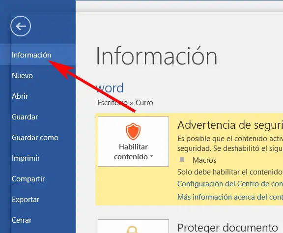 Par conséquent, une fois que nous avons créé un document texte dans Word, avant de le stocker ou de le partager avec d’autres, nous allons éditer et personnaliser ses propriétés. Pour ce faire, la première chose que nous faisons est d’aller dans le menu «Fichier» du programme, où nous sélectionnons l’option «information». Ensuite, dans la section «Propriétés», nous cliquons sur «Propriétés avancées», ce qui nous amène à la fenêtre qui nous intéresse.