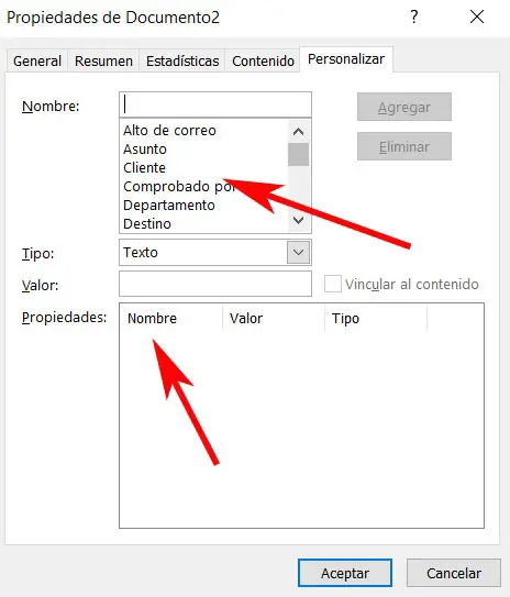 Dans celui-ci, nous trouvons plusieurs onglets , donc dans ce cas nous sélectionnons celui appelé «Personnaliser» pour indiquer les propriétés correspondantes du document. C’est là que nous aurons déjà la possibilité de spécifier les champs que nous voulons remplir et qui seront stockés dans le fichier lui-même.