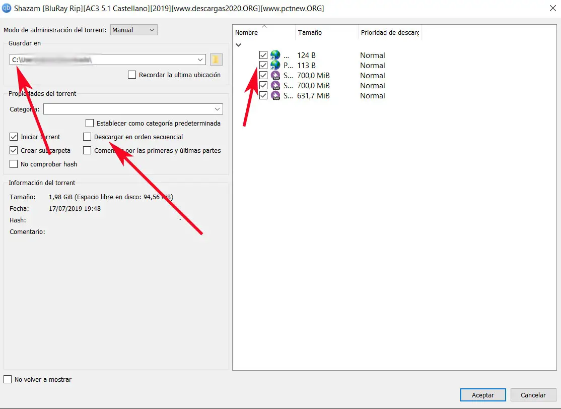 Par contre, si le torrent en question est composé de plusieurs fichiers à l’intérieur, ce qui est assez fréquent, dans le panneau central, nous pouvons choisir ceux que nous voulons télécharger. Cela signifiera un gain de temps important, car dans de nombreux cas, nous n’aurons pas besoin de télécharger tout le contenu d’un torrent. Par conséquent, de cette manière, nous ne pouvons sélectionner que les parties que nous devons vraiment enregistrer sur le disque dur localement.
