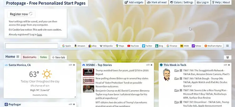 Pour de nombreux utilisateurs, c’est la meilleure alternative à Start.me. Avec Protopage, nous aurons notre page d’accueil personnalisée à partir de laquelle nous pouvons accéder à partir de n’importe quel ordinateur ou mobile. Nous pouvons l’utiliser pour personnaliser notre propre sélection d’actualités, incorporer des notes, une liste de tâches et mettre à jour les signets. Cette page se charge de remplacer les moteurs de recherche ou les signets des navigateurs post des raccourcis ou des lanceurs d’applicationset les services Web. Sa conception est basée sur des widgets glisser-déposer pour éditer et configurer à notre guise. En eux, nous pouvons ajouter toutes sortes d’informations, nouvelles, audios, vidéos, etc. Son principal inconvénient est qu’il est entièrement en anglais et comporte tellement d’options qu’il peut être accablant pour les utilisateurs inexpérimentés.