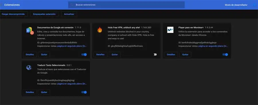 Par conséquent, dans le cas où nous rencontrions l’une de ces situations inconfortables, nous allons vous montrer comment les résoudre. Ainsi, dans le cas où nous voyons qu’une extension ne fonctionne pas correctement, la première chose que nous faisons est d’y accéder comme nous vous l’avons montré précédemment à partir du menu Chrome . Ensuite, nous allons nous retrouver dans la fenêtre de contrôle du même, où nous voyons tous ceux qui sont installés à ce moment-là.