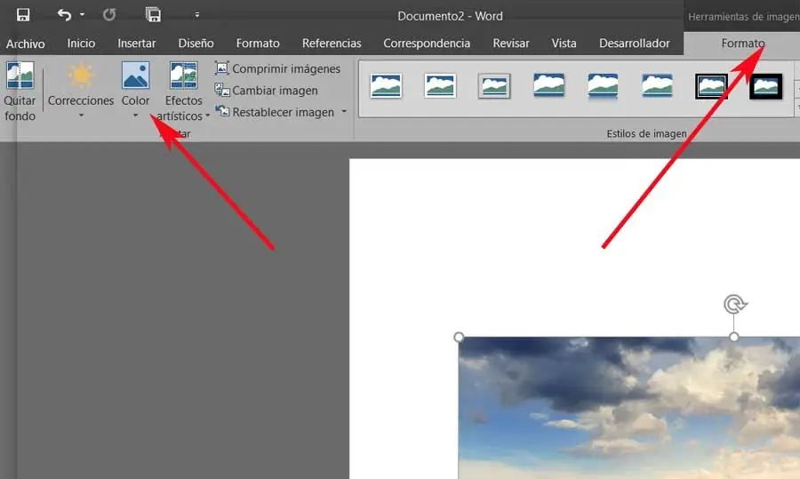Au début, la première chose qui peut venir à l’esprit est d’accéder à l’emplacement du disque où nous l’avons enregistré et de l’ouvrir avec un éditeur de photos spécifique . Ensuite et après l’utilisation de certaines de ses fonctions, nous aurons ce qui nous intéresse. De cette façon, nous aurons la possibilité de l’ajouter ultérieurement au document Word déjà modifié. Cependant, à ce stade, il est également intéressant de savoir que nous pouvons changer une image ajoutée dans le programme de texte, directement en noir et blanc dans Word. Évidemment, tout cela sans avoir à quitter l’ application Office en tant que telle et sans utiliser de solutions logicielles tierces.