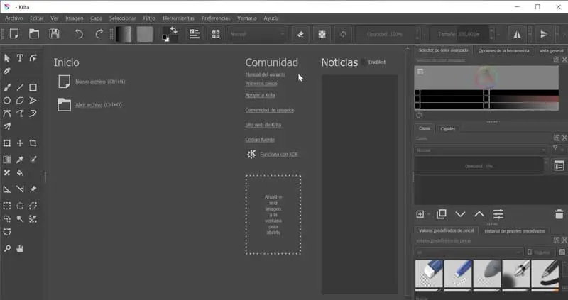 L’ interface utilisateur Krita est l’une de ses forces car elle est extrêmement intuitive. Il a une façon de travailler similaire à celle que l’on peut trouver dans d’autres programmes tels que Photoshop ou Corel Painter, puisque nous aurons des filtres, des calques, des modes de fusion, des pinceaux de déformation et toutes sortes de possibilités. Il est également possible de modifier les raccourcis clavier, afin de pouvoir l’adapter aux outils que nous utilisons le plus fréquemment.