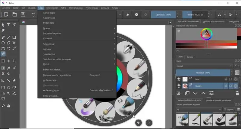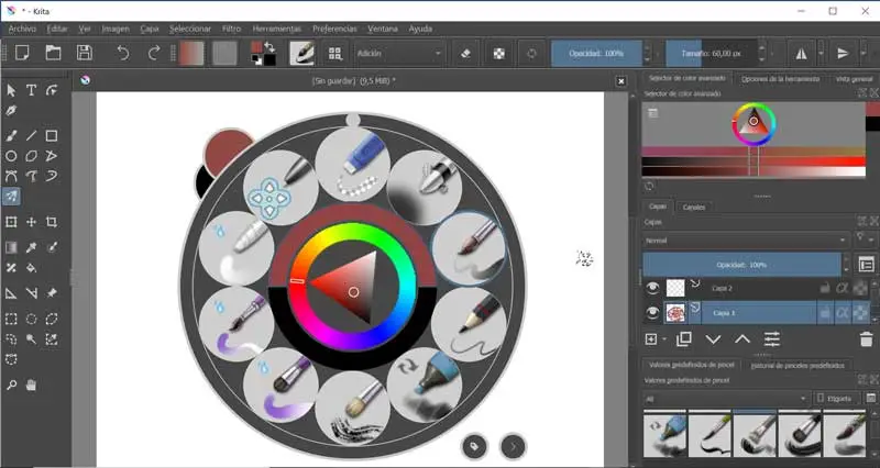 Krita a une puissante palette de couleurs pop-up que nous pouvons activer en cliquant avec le bouton droit de la souris. À partir de là, nous pouvons rapidement choisir la couleur et le pinceau dont nous avons besoin. À l’extérieur de la palette, nous aurons le sélecteur de couleur qui contient les couleurs que nous avons utilisées le plus récemment. Avec le système d’étiquetage de Krita, nous pouvons échanger les brosses disponibles qui apparaissent à l’écran, que nous pouvons configurer à partir de la section Préférences, en haut.