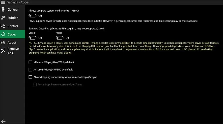 Dans le même temps et comme c’est généralement le cas avec la plupart des applications que nous rencontrons, ACG Player nous propose une série d’options personnalisables. Celles-ci nous permettront d’adapter un peu plus le fonctionnement du programme à nos besoins. De cette façon, nous pouvons activer le codec audio et vidéo FFmpeg si nécessaire, personnaliser l’apparence des sous-titres lorsqu’ils sont intégrés, etc.