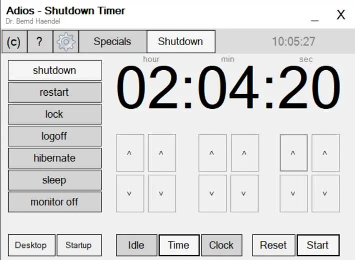 A su vez, un poco más abajo vemos tres botones que muestran los diferentes tipos de temporizador que podemos asignar. El primero de ellos, Adle, se pone en marcha cuando no hay actividad de ratón o teclado. El segundo modo, Time, es una cuenta atrás, por lo que cuando el temporizador llega a cero, ejecuta el comando para el modo elegido. Por último Clock ejecuta la tarea a la hora y minuto que hayamos establecido previamente. Para todo ello, antes debemos asegurarnos de haber pinchado en el botón Start.