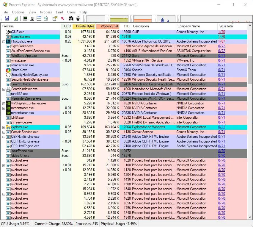 Le Gestionnaire des tâches de Windows connaît tous les programmes et processus en cours d’exécution sur notre ordinateur. Et aussi, au cas où l’un d’eux serait bloqué, cela nous permet également de le fermer de force pour déverrouiller l’ordinateur. Cependant, il existe d’autres gestionnaires de tâches beaucoup plus complets et avancés, tels que Process Explorer, qui nous permettent de voir tous ces processus plus en détail. De plus, une caractéristique très intéressante de ce programme est qu’il nous permet d’envoyer tous les processus à VirusTotal pour savoir s’ils sont légitimes ou si nous avons un virus dans la mémoire de notre ordinateur.