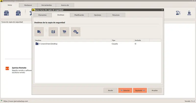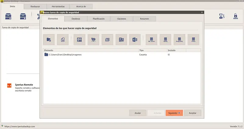 Si nous cliquons sur le bouton «Créer une nouvelle tâche de sauvegarde», une nouvelle fenêtre apparaîtra pour créer une sauvegarde. Nous y avons plusieurs onglets tels que «Éléments», «Destinations», «Planification», «Options» et «Résumé». Tous nous aideront à configurer et à stocker notre copie . Avec le premier bouton, nous pouvons ajouter des dossiers tandis qu’avec le second nous pouvons ajouter des fichiers qui constitueront notre copie et ce seront les options que nous utiliserons le plus, surtout si nous optons pour la version gratuite du programme.