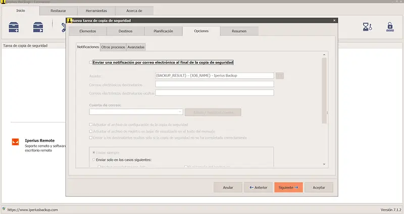 La section suivante est «Options», à partir de laquelle nous pouvons envoyer une notification par e-mail à la fin de la sauvegarde. Nous pouvons également exécuter d’autres processus avant ou après la copie, ainsi que configurer certaines options avancées.