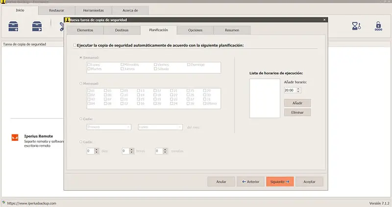 Plus tard, dans l’onglet «Planifier», nous pouvons exécuter une sauvegarde sur une base planifiée en fonction des paramètres que nous effectuons. De cette façon, nous pouvons le faire chaque semaine, chaque mois ou de temps en temps. De la même manière, nous pouvons également insérer l’horaire choisi.