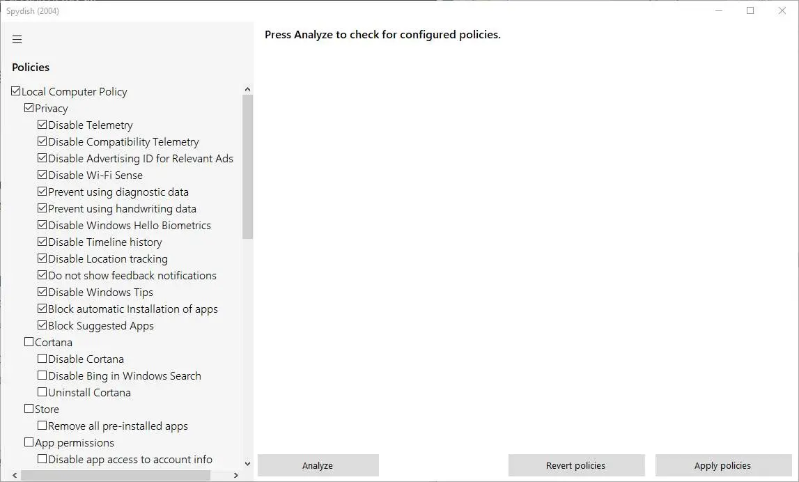 Spydish est un programme quelque peu différent. Au lieu d’apporter des modifications internes au système d’exploitation, ce programme lit les paramètres des politiques de confidentialité du système d’exploitation et, à partir de là, applique les modifications nécessaires.
