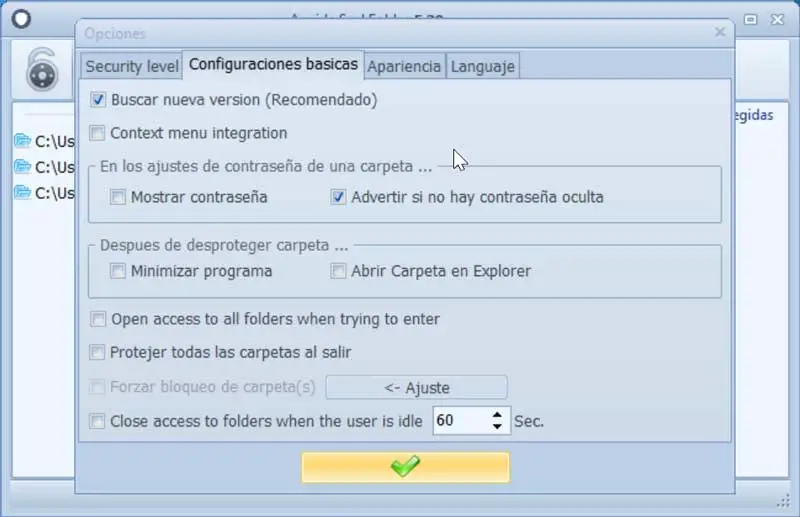 Si nous cliquons à nouveau sur l’icône de la clé, cela nous amène à la section des options où nous trouvons l’onglet Paramètres de base . De là, nous pouvons sélectionner que le programme soit intégré dans le menu contextuel de Windows, définir les paramètres de mot de passe pour un dossier ou les actions à entreprendre après la déprotection d’un dossier. Il a également un onglet Apparence où nous pouvons changer la peau et ajouter un effet Aero et un effet d’animation.