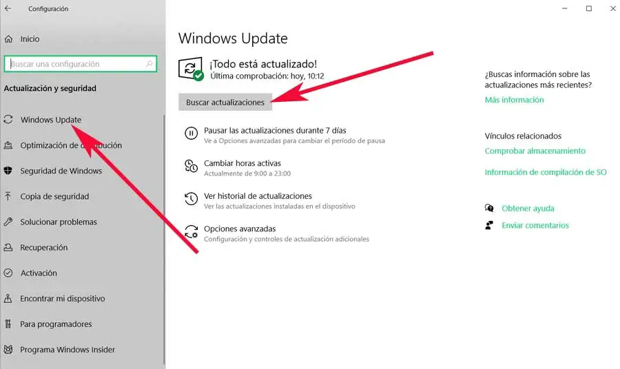 Comment pourrait-il en être autrement, c’est quelque chose qui s’étend à la proposition de Microsoft pour Windows 10 dont nous avons parlé. C’est pourquoi nous sommes prêts à vous montrer comment maintenir à jour la solution antivirus à tout moment, même manuellement. Eh bien, pour cela, la première chose que nous faisons est de rouvrir l’application Paramètres Windows à partir de Win + I. Nous allons également dans Mise à jour et sécurité, cependant dans ce cas nous opterons pour la fonction Windows Update des options de droite de la fenêtre .