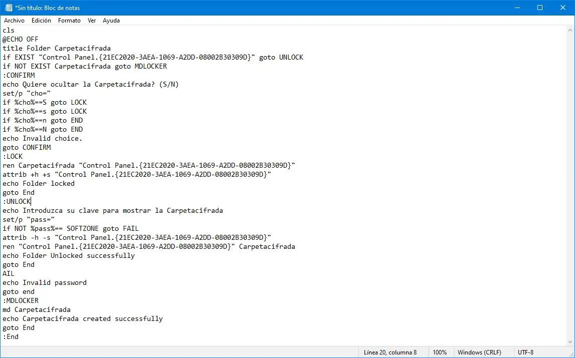Là où nous trouvons «Dossier chiffré», nous devons le remplacer par le nom du répertoire que nous voulons protéger et aussi, nous devons remplacer «SOFTZONE» par le mot de passe que nous voulons protéger le répertoire.